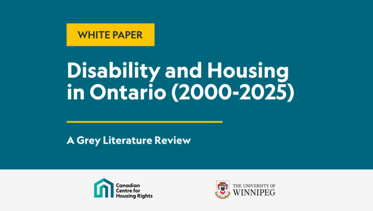 From a right to housing perspective, homelessness is a gross violation of the right to housing, and governments must do everything within their power to prevent homelessness amongst their population. Losing one’s home is a key pathway to homelessness, and viewed from a right to housing perspective, eviction violates the right to housing by removing security of tenure. By incorporating a right to housing lens, this research will examine why, and in what ways, existing policies and adjudicative processes may violate the right to housing of people with disabilities in Canada. It will also point to solutions that strengthen the right to housing and prevent homelessness for disabled people.